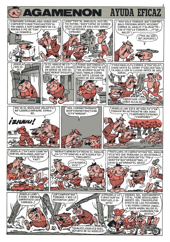 Proseguimos en el repaso a la población de Villamulos y en el personal que rodea las rústicas historias de Agamenón. Tenemos al propietario de la tienda local, El Tío Perico, negociante de pro, con su cartel “Hoy no se fía, mañana si”, que ya hemos visto que, además, forma parte de la Prisidencia Monicipal del Monicipio. Aparece en una de mis historias favoritas, El Gran Cross, donde comencé en mis más tiernos años a apreciar a Agamenón, Bernabé Sesoclaro, “vecino que, contrariamente al resto de los villamulinos, lee libros en lugar de cavar nabos”, y que “le ha crecido mucho la cabeza y muy poco todo lo demás” el resto del reparto que se presenta es digno de elogio, pero son forasteros, así que os dejaré disfrutarlos en la historieta.